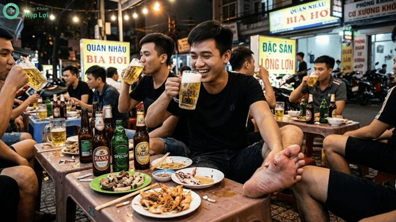 - Văn hóa nhậu nhẹt, bia rượu: Các buổi tiệc tùng, giao tiếp liên miên là nguyên nhân hàng đầu. Cồn trong bia rượu không chỉ làm tăng sản sinh axit uric mà còn ức chế quá trình đào thải chất này qua thận.