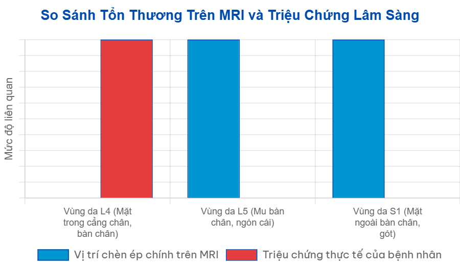 Một điểm rất thú vị trong ca bệnh này là sự không tương xứng giữa vị trí tổn thương (L5/S1) và triệu chứng của bệnh nhân (thường liên quan đến L4). Biểu đồ dưới đây cho thấy sự khác biệt này, nhấn mạnh tầm quan trọng của việc không chỉ dựa vào triệu chứng mà phải kết hợp nhiều phương pháp chẩn đoán.