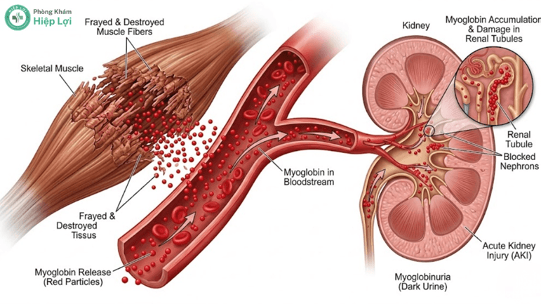 Hậu quả là các thành phần bên trong tế bào cơ – đặc biệt là Myoglobin (một loại protein chứa sắt dự trữ oxy cho cơ), enzyme Creatine Kinase (CK), Kali và Phospho – sẽ bị rò rỉ và tràn ồ ạt vào hệ tuần hoàn. Thận đóng vai trò lọc máu, nhưng khi lượng Myoglobin đổ về quá lớn, chúng sẽ cô đặc lại, làm tắc nghẽn các ống thận và gây hoại tử tế bào thận chỉ trong thời gian rất ngắn.