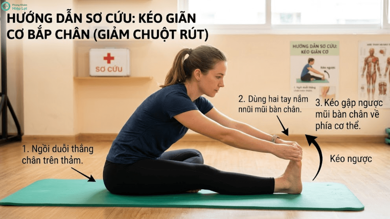 Kéo gập mũi bàn chân ngược về phía cơ thể là động tác sơ cứu nhanh nhất giúp làm giãn bó cơ bắp chuối đang bị co thắt.