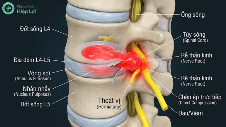 - Thoát vị đĩa đệm thắt lưng: Đây là biến chứng rất phổ biến. Dưới áp lực lớn (như bưng bê vật nặng sai tư thế), nhân nhầy bên trong đĩa đệm thoát ra ngoài qua vết rách của vòng sợi, trực tiếp chèn ép vào ống sống hoặc rễ thần kinh.