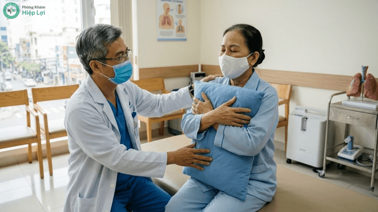 - Vật lý trị liệu (Tập thở sâu): Kỹ thuật viên sẽ hướng dẫn bạn ôm một chiếc gối mềm áp sát ngực (để đỡ lực khi ho) và tập hít thở sâu định kỳ. Việc hít sâu giúp phổi nở hết cỡ, tống xuất đờm dãi, ngăn chặn viêm phổi.