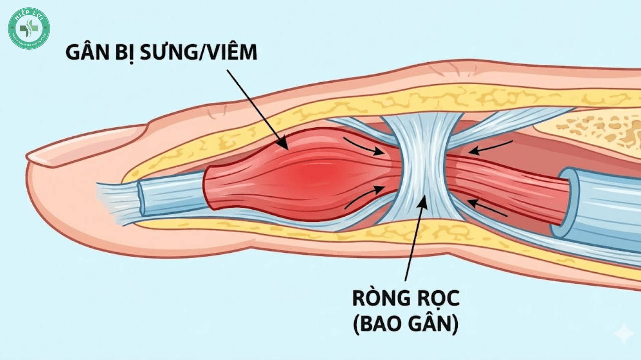Do bao gân bị viêm, sưng nề làm hẹp "đường hầm" khiến gân gấp không thể trượt trơn tru bên trong.
