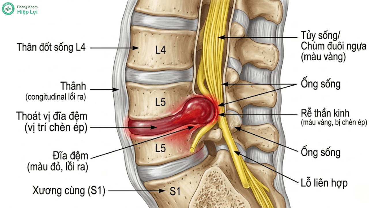 Thoát vị đĩa đệm chèn ép rễ thần kinh tọa là nguyên nhân bệnh lý phổ biến nhất khiến cơn tê buốt lan dọc từ mông xuống gót chân.