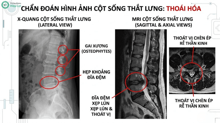 Chụp X-quang và Cộng hưởng từ (MRI) là tiêu chuẩn vàng giúp bác sĩ đánh giá chính xác mức độ mài mòn sụn khớp và chèn ép thần kinh.