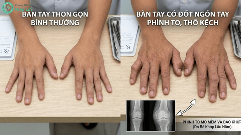 - Biến dạng, mất thẩm mỹ: Việc kéo giãn bao khớp liên tục làm tổn thương các mô nang liên kết xung quanh. Cơ thể sẽ phản ứng bằng cách làm phì đại các mô này, khiến các đốt ngón tay trở nên to, thô, bè ra và rất xấu xí so với ngón tay người bình thường.