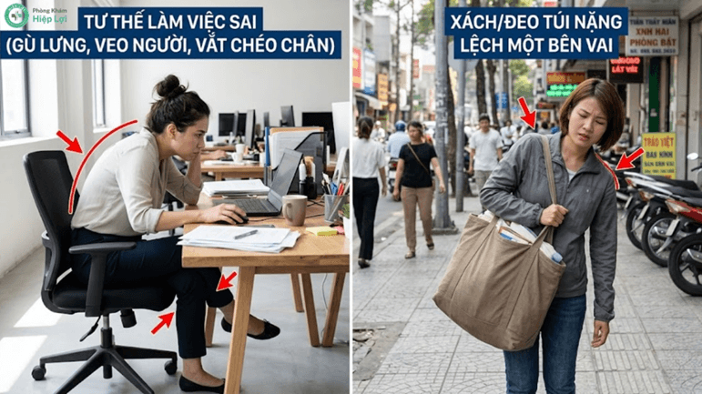 Thói quen ngồi làm việc gù lưng, vắt chéo chân hay mang vác lệch một bên kéo dài là yếu tố thúc đẩy vẹo cột sống ở người trưởng thành.
