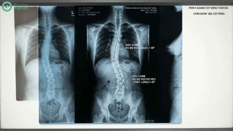 Chụp X-quang toàn bộ cột sống là phương pháp bắt buộc giúp bác sĩ đo chính xác góc vẹo (góc Cobb) để đưa ra phác đồ nắn chỉnh phù hợp nhất.